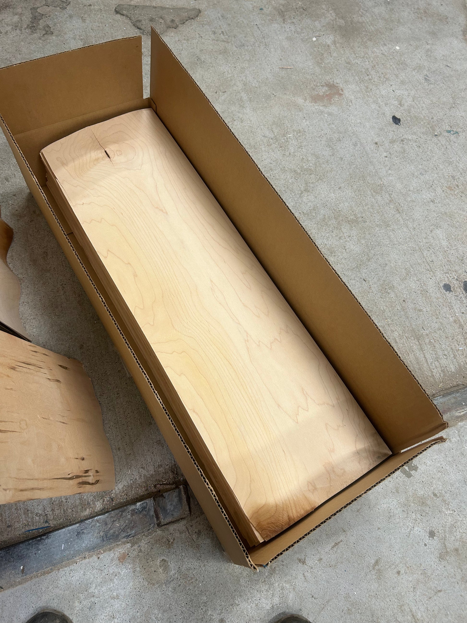 We have an over abundance of Canadian / North American maple, long grain core plies. These plies can be made usable if you have the time to flatten, fill, or repair the large cracks. 60 pcs unsorted pcs per box @ approximately 1/16 thick x 10” x 35”